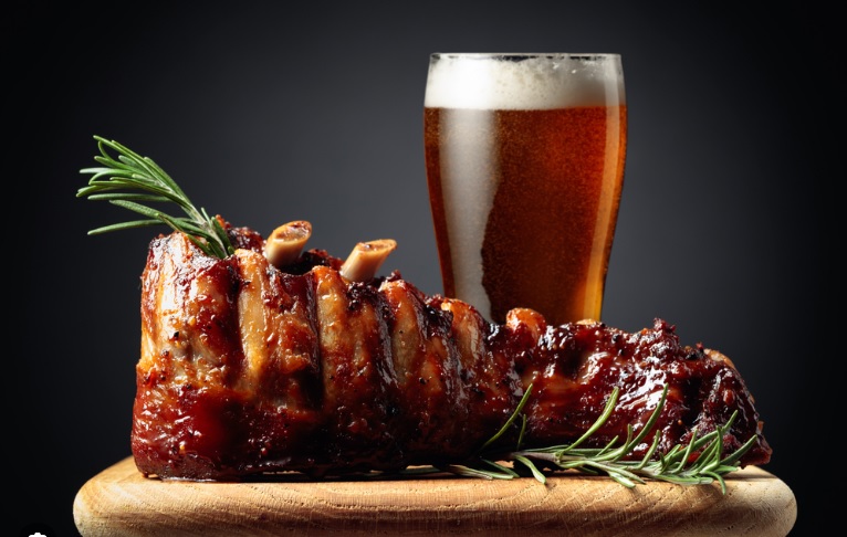 Costilla de cerdo ahumada, confitada en cerveza y miel, terminada a la brasa.